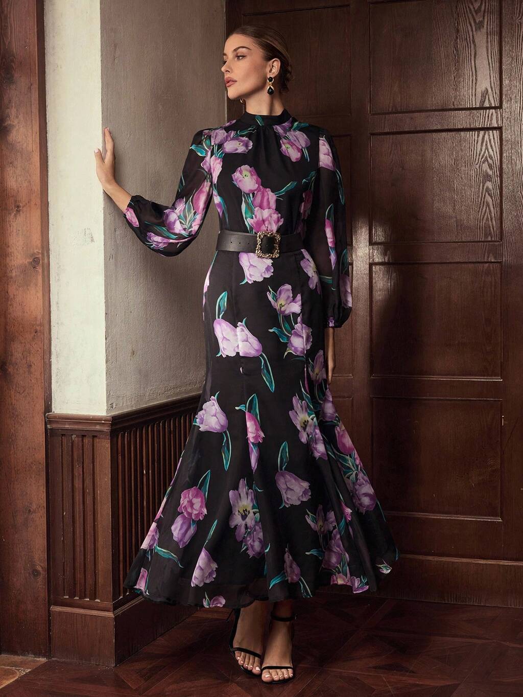 WOMEN'S SPRING/AUTUMN FULL FLORAL PRINT LANTERN SLEEVE BELTED DRESS