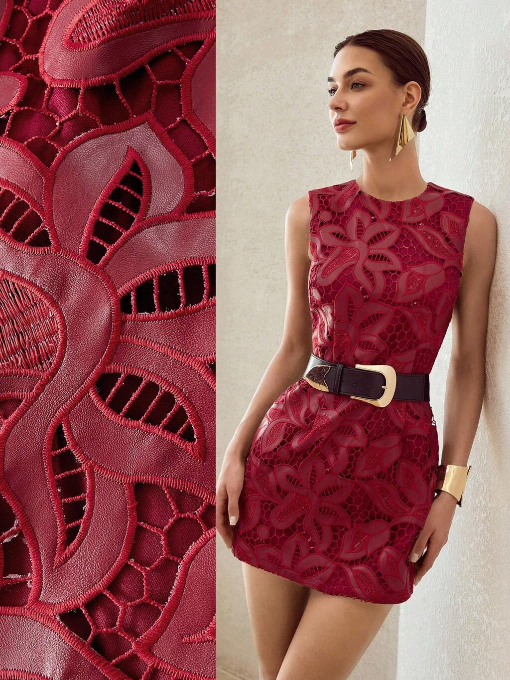 PU LEATHER EMBROIDERY STEREO FLOWER SLEEVELESS MINI DRESS