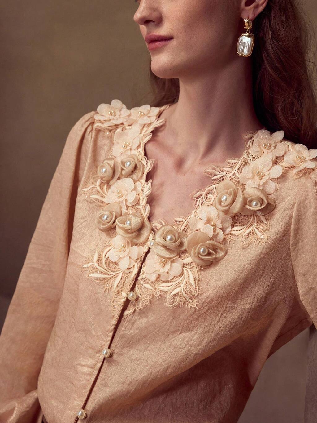 WOMEN'S LACE TRIM FLARE LONG SLEEVE STEREO FLOWER DETAIL BLOUSE, FASHIONABLE & ELEGANT