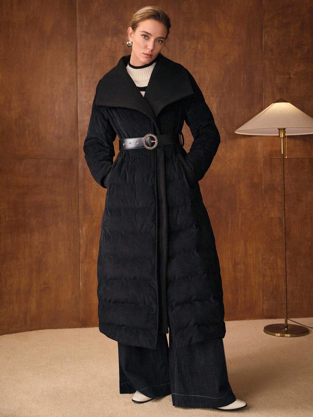 WOMEN'S CORD PATCHWORK PADDED COAT WITH BELT