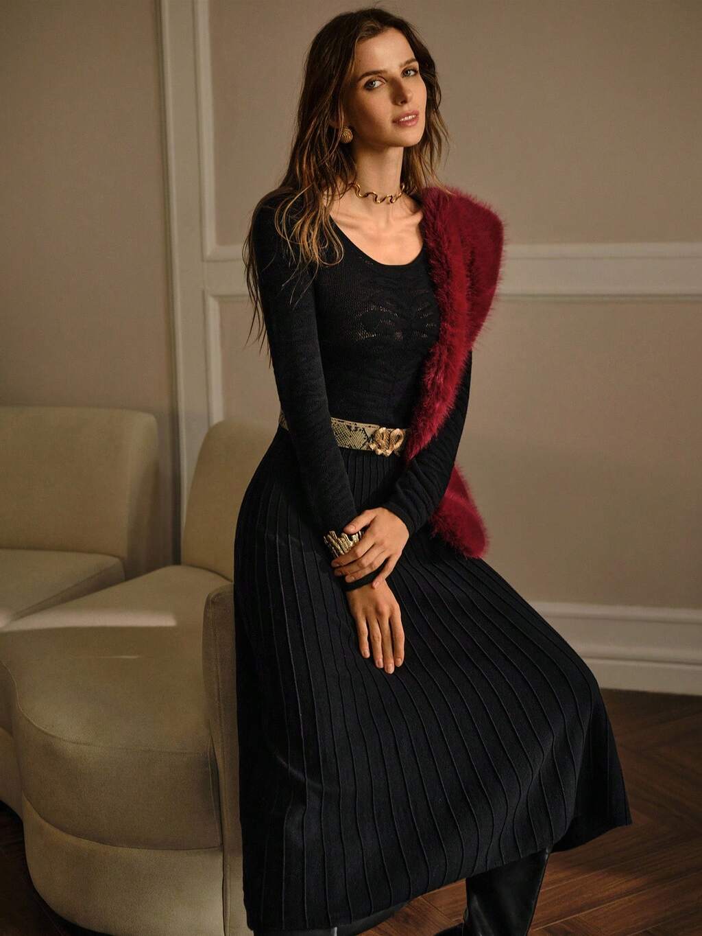 V-NECK RHINESTONE VELVET JACQUARD DRESS