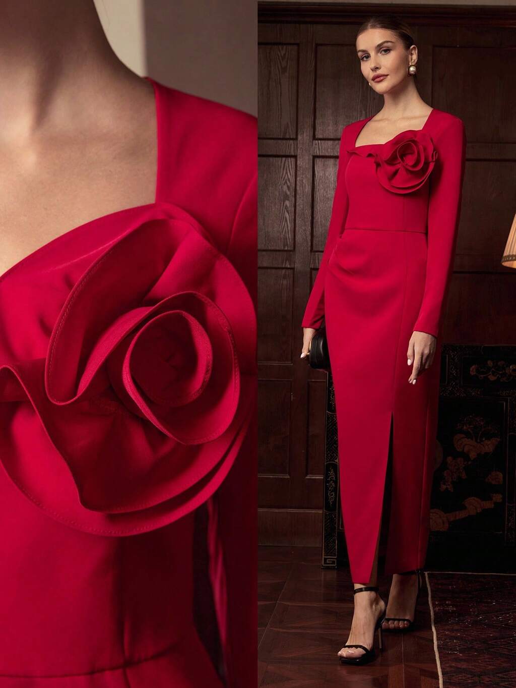 ZEYLAH Elegant Long Floral Print Waist Tie Long Sleeve Dress, Autumn/Winter