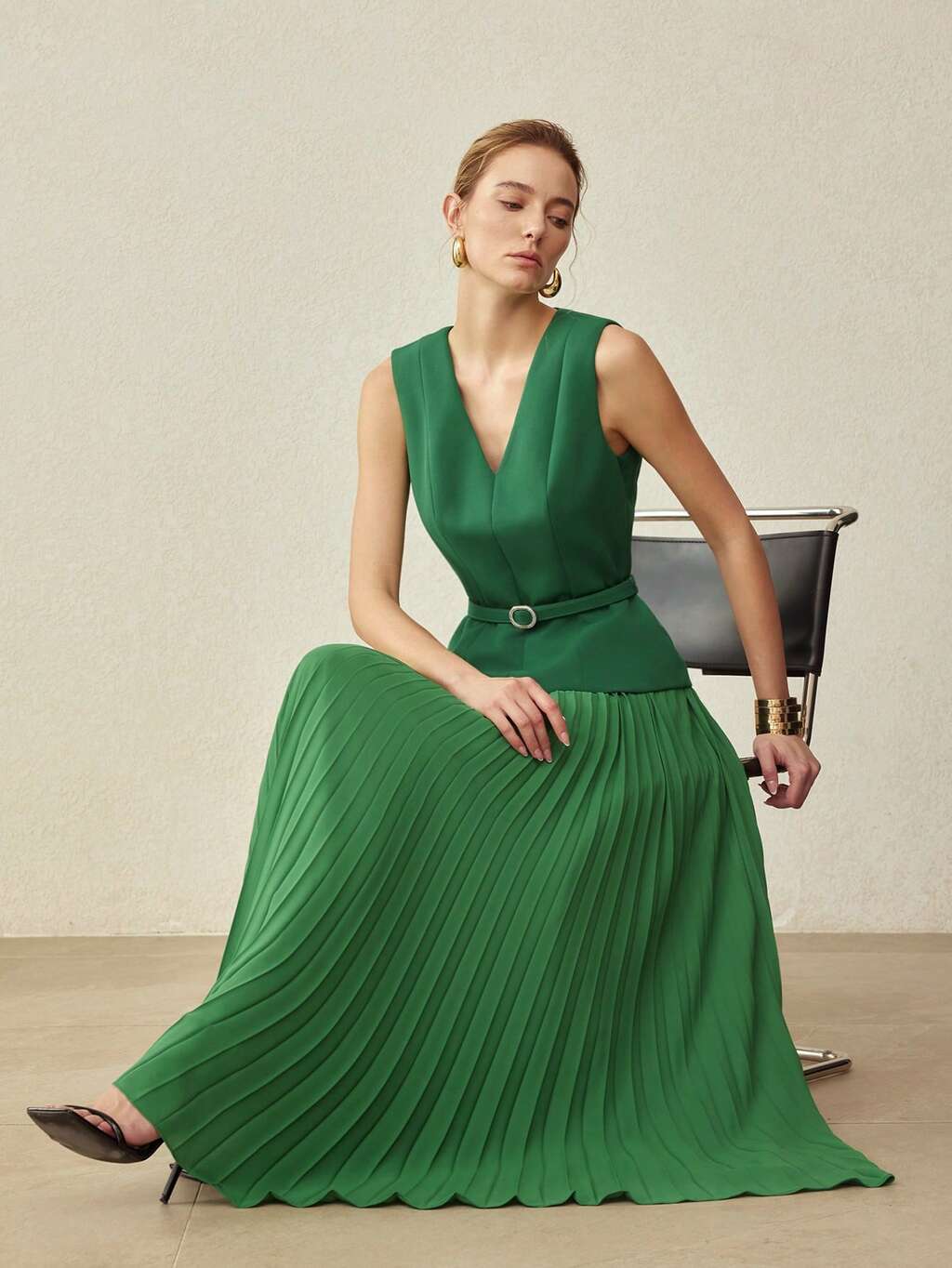SLEEVELESS BELTED PLEATED DRESS, ELEGANT FOR COMMUTING, SPRING/SUMMER