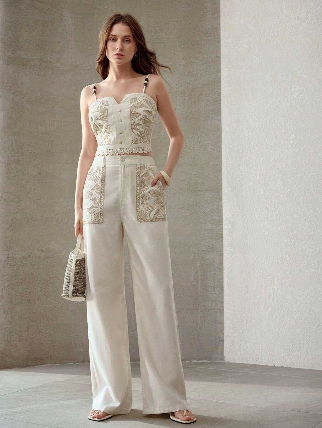EMBROIDERY SLANT POCKET WIDE LEG PANTS