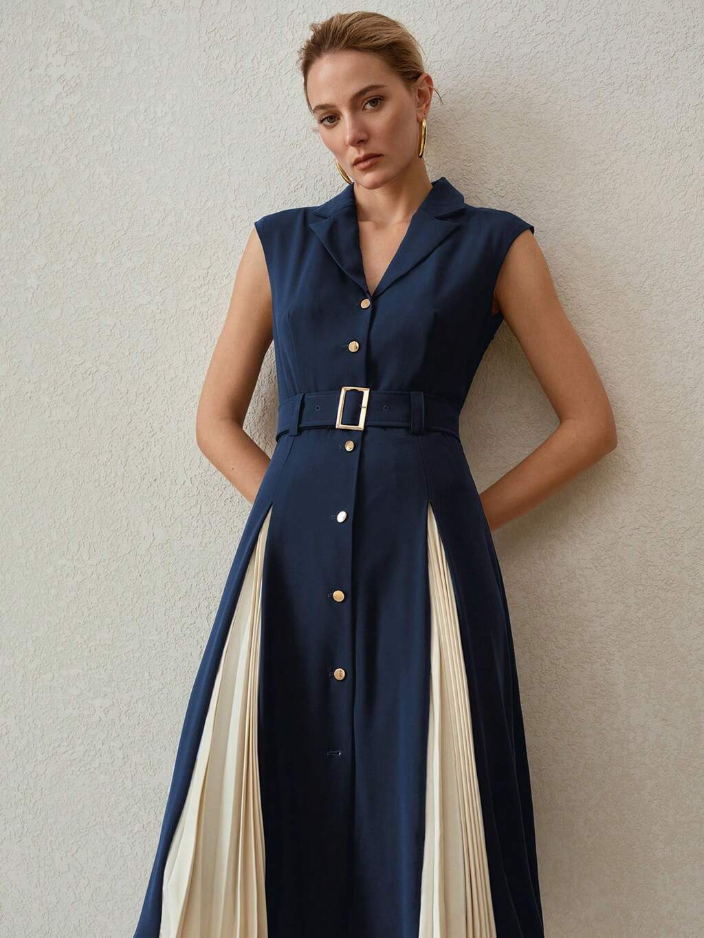 LAPEL COLLAR CONTRAST PLEATED PANEL BUCKLE BELTED DRESS,SUMMER OUTFITS