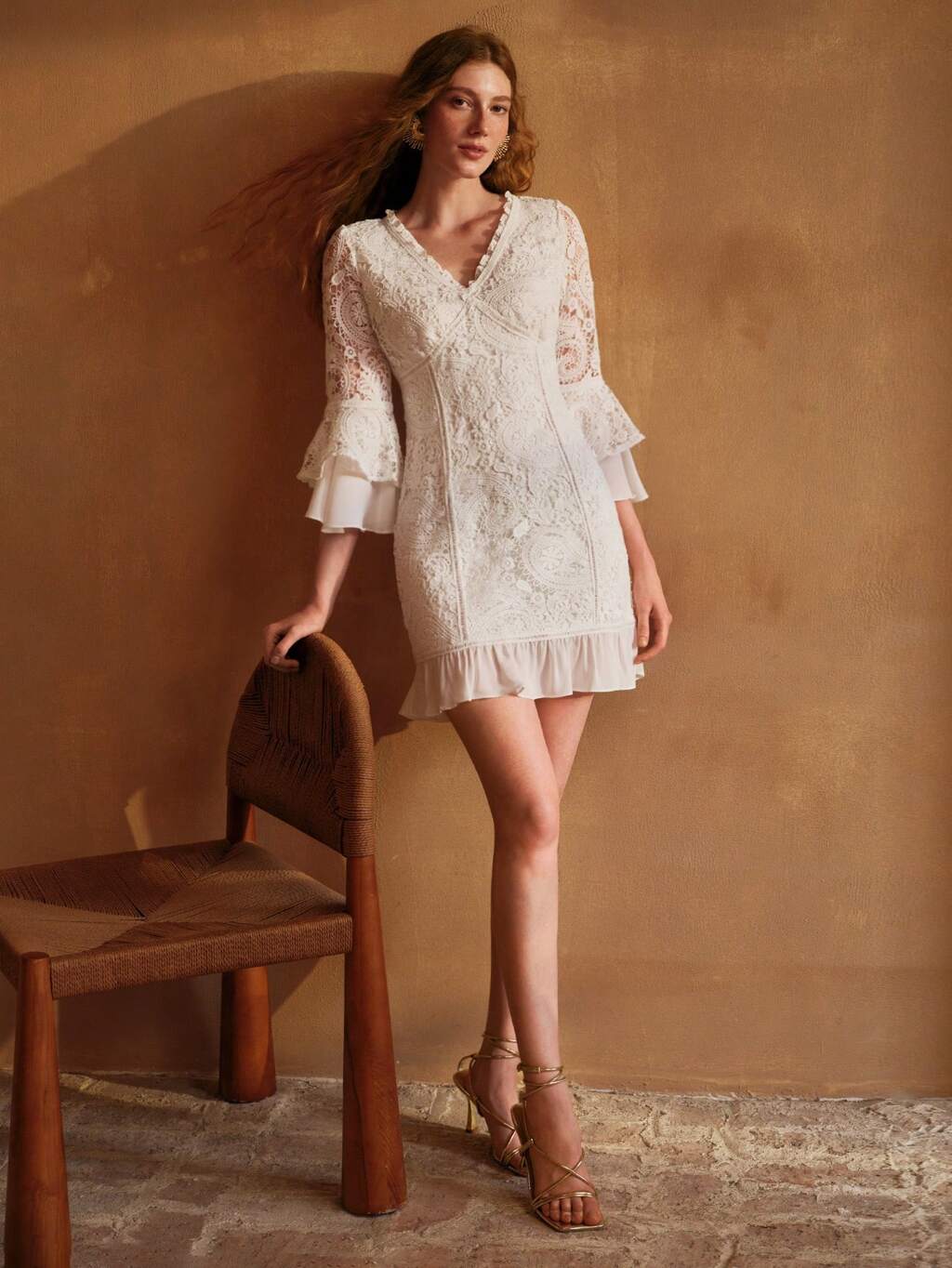 WOMEN'S FITTED ELEGANT MESH JACQUARD FLARE SLEEVE SHORT DRESS