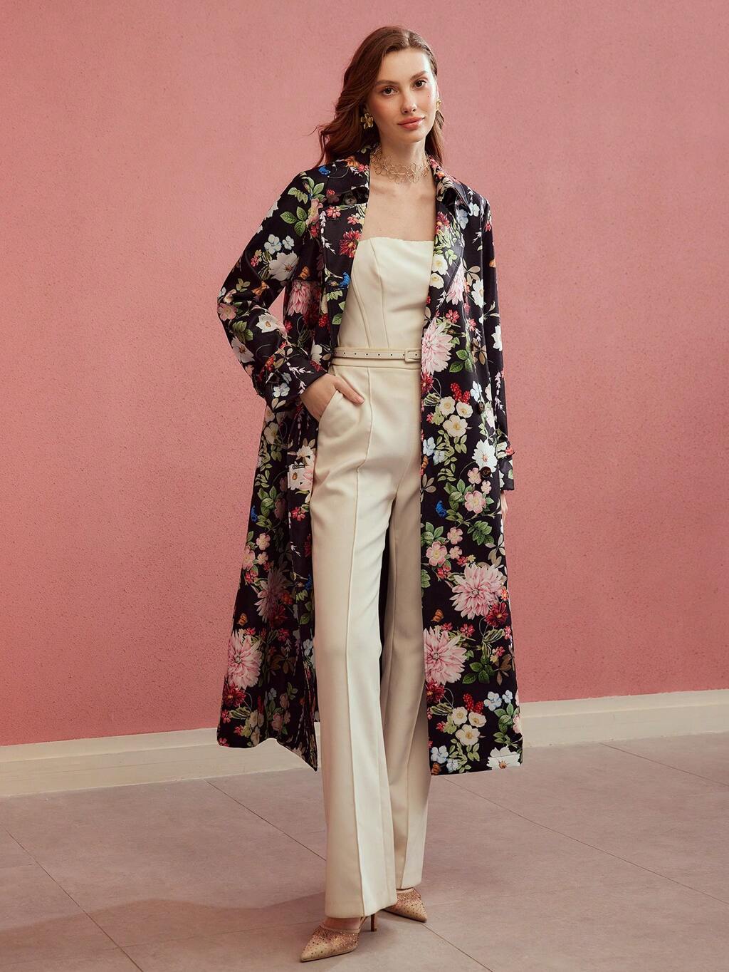 FLORAL PRINT DOUBLE BREASTED TRENCH COAT,SPRING/SUMMER