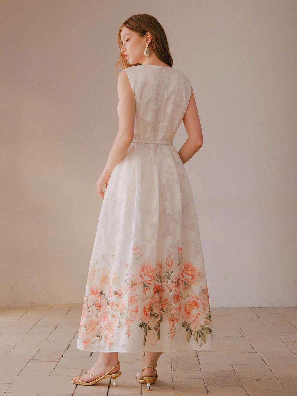 FLORAL PRINT JACQUARD FLOWER APPLIQUE RHINESTONE BELTED SLEEVELESS DRESS
