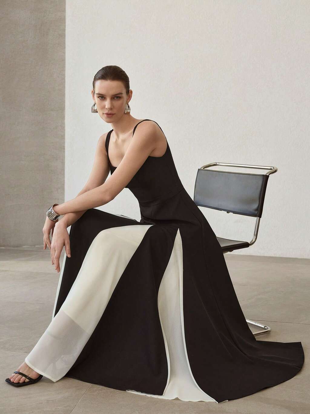 WOMEN'S FRENCH STYLE BLACK & WHITE COLOR BLOCK SLIP DRESS, VACATION & EVENING GOWN