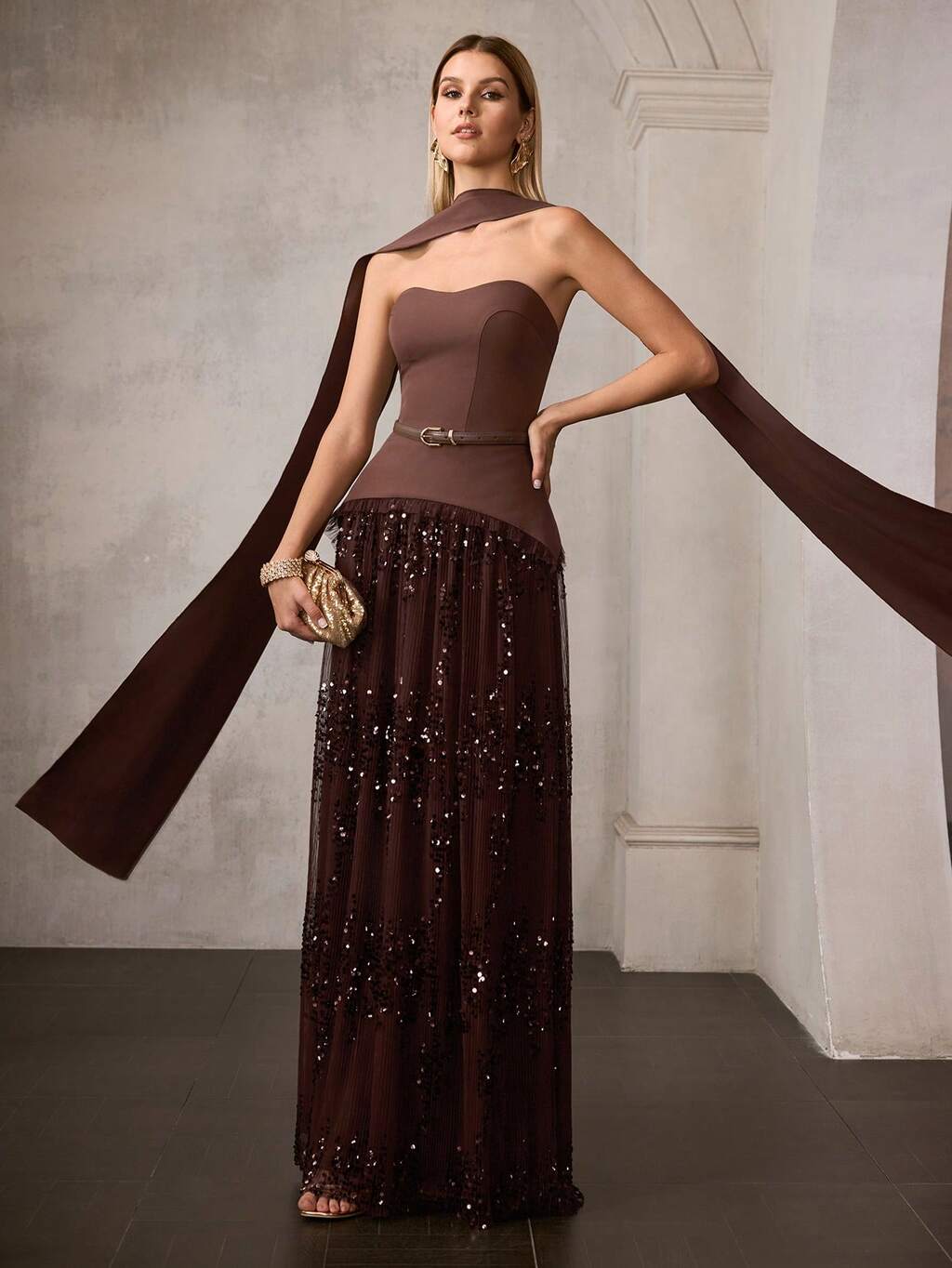 MOTF Soiréza ELEGANT BROWN NEW YEAR PARTY DRESS FOR WOMEN ,STRAPLESS SPAGHETTI STRAP , WAIST-CINCHING BELT, SHIMMERING SEQUIN-EMBELLISHED EMBROIDERED TULLE SKIRT, ATTACHED STRUCTURED DETACHABLE TIE, BODYCON FIT FOR EVENING EVENTS & FORMAL PARTIES