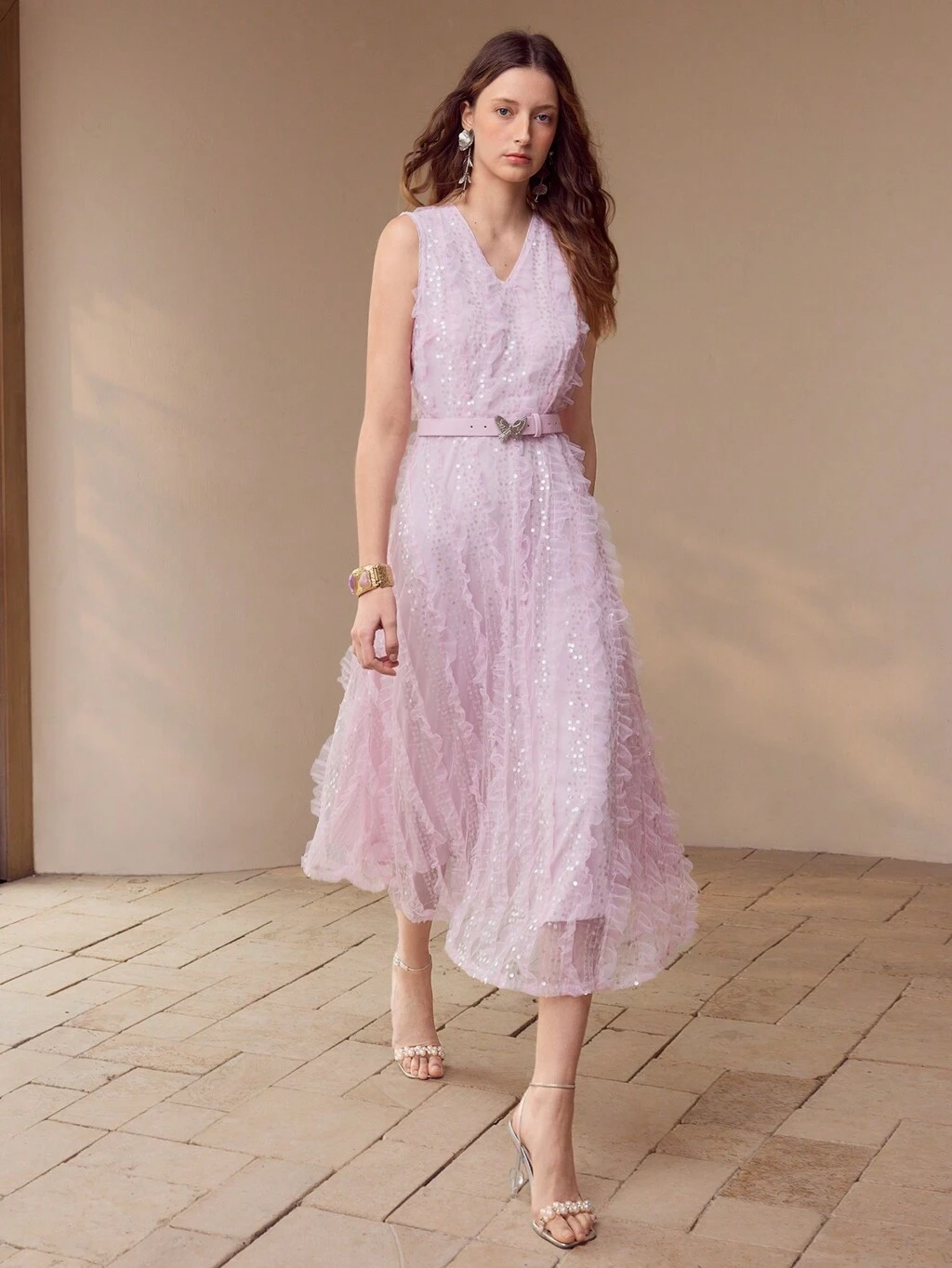 WOMEN'S LACE OVERLAY ROMANTIC ELEGANT RUFFLE TRIM RHINESTONE BELTED MAXI DRESS