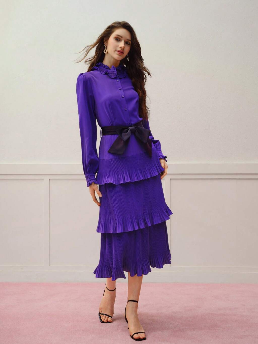 ZEYLAH SOLID V-NECK FLARE SLEEVE RUFFLE TRIM PLEATED DRESS WITHOUT BELT