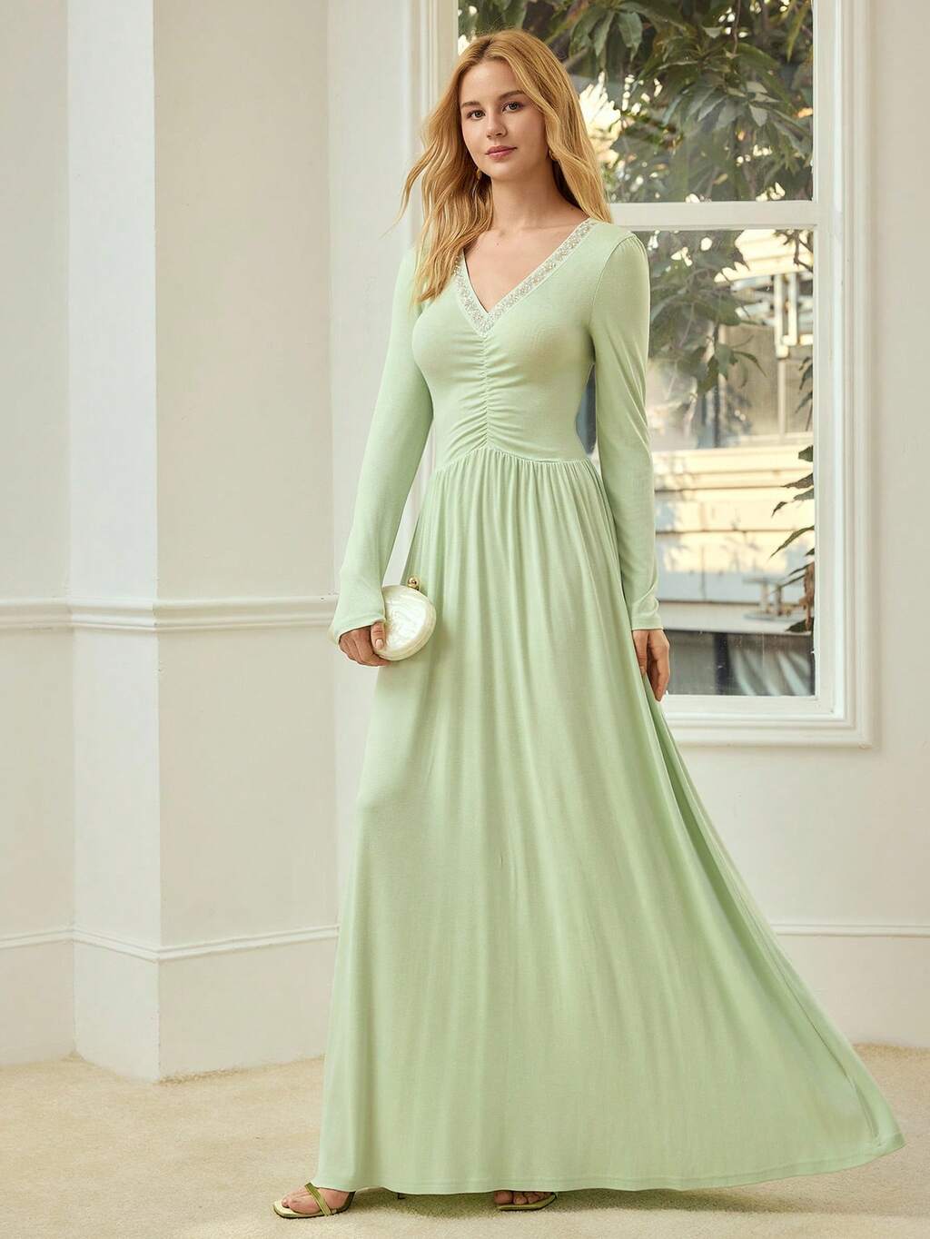 WOMEN'S V-NECK LONG SLEEVE RUCHED LONG DRESS, SPRING/SUMMER