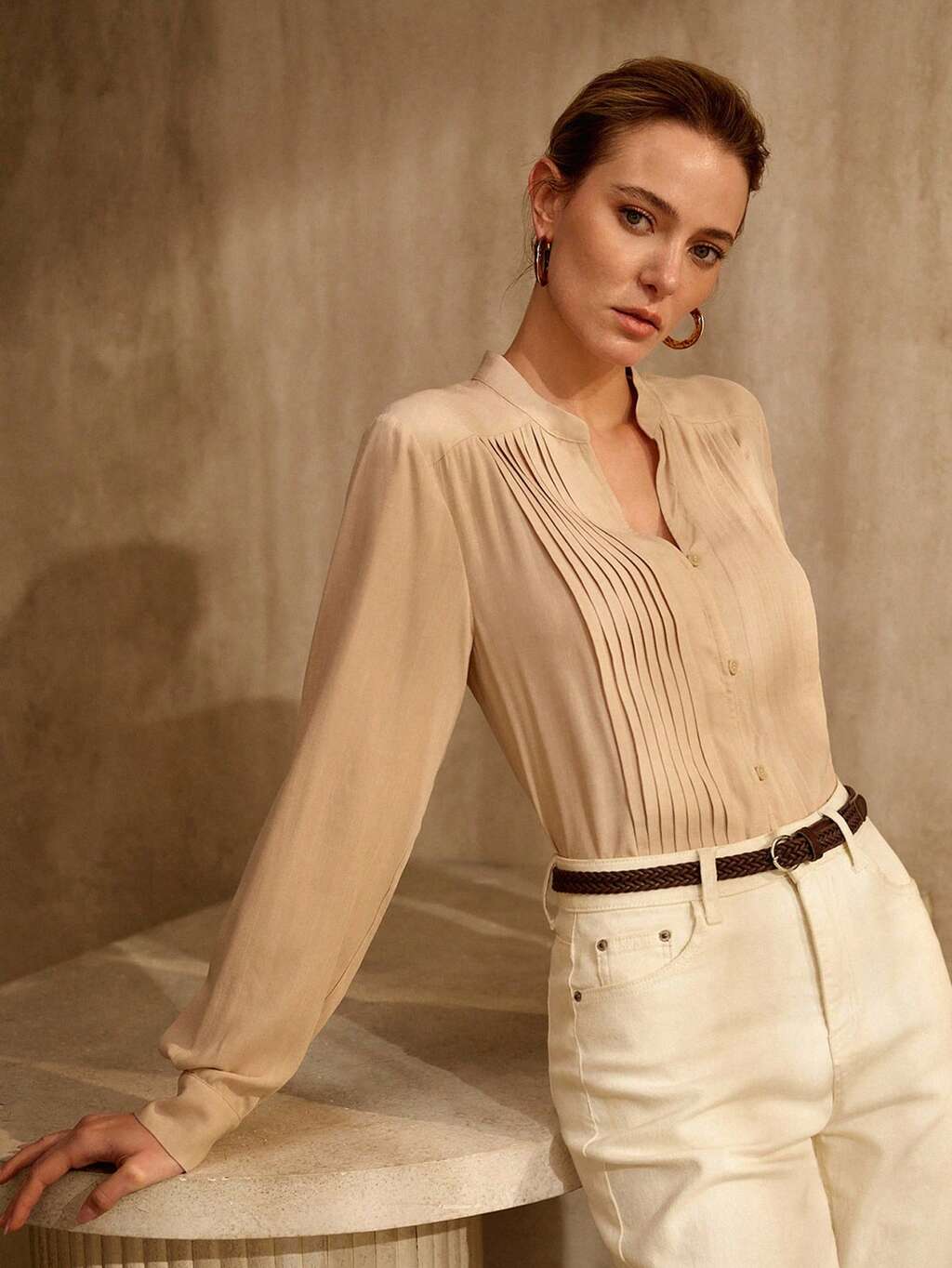 SOLID FOLD PLEATED WIDE LEG PANTS WITH BELT