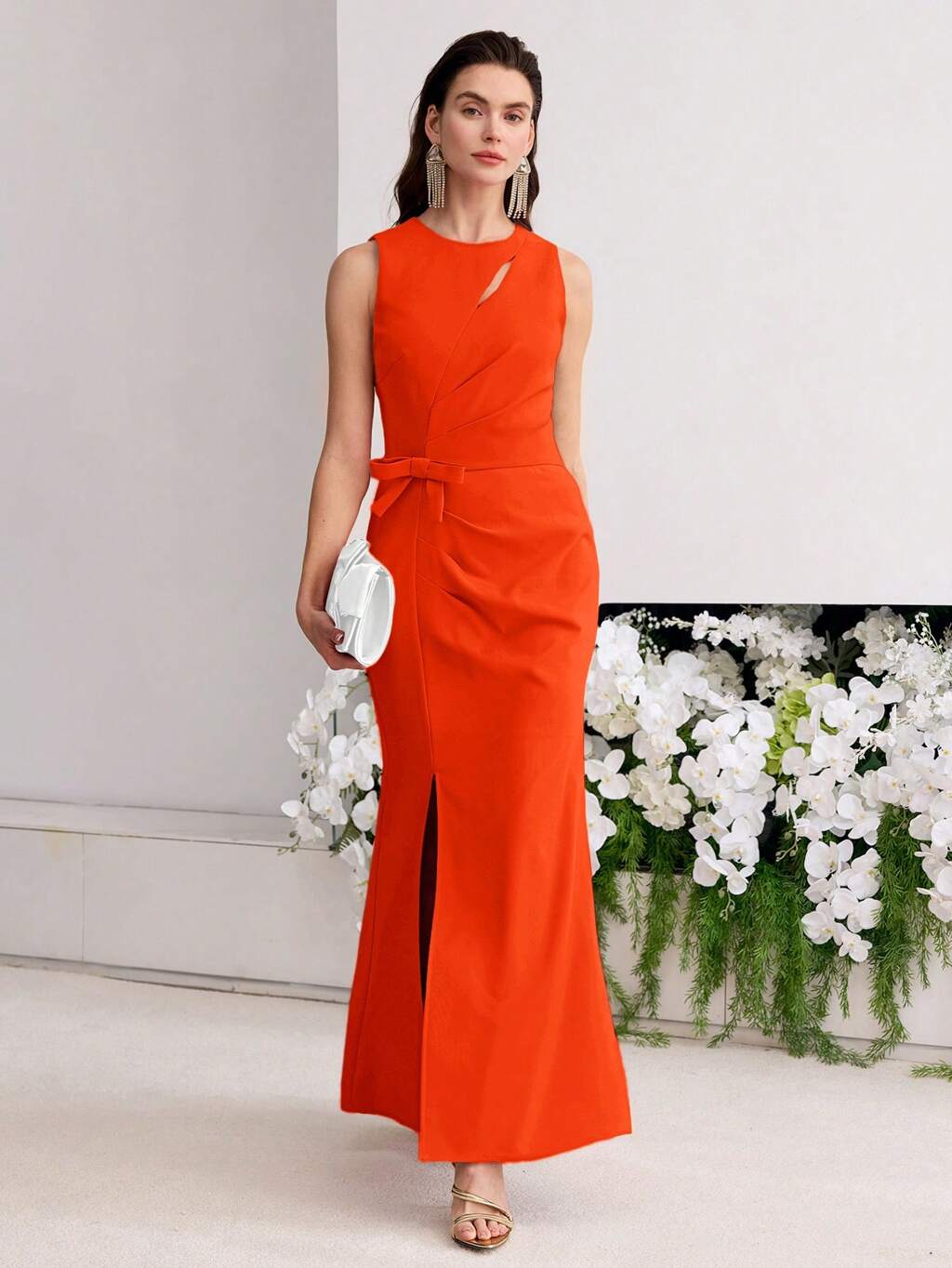 SOLID BOW DECOR SPLIT THIGH MERMAID HEM LONG DRESS