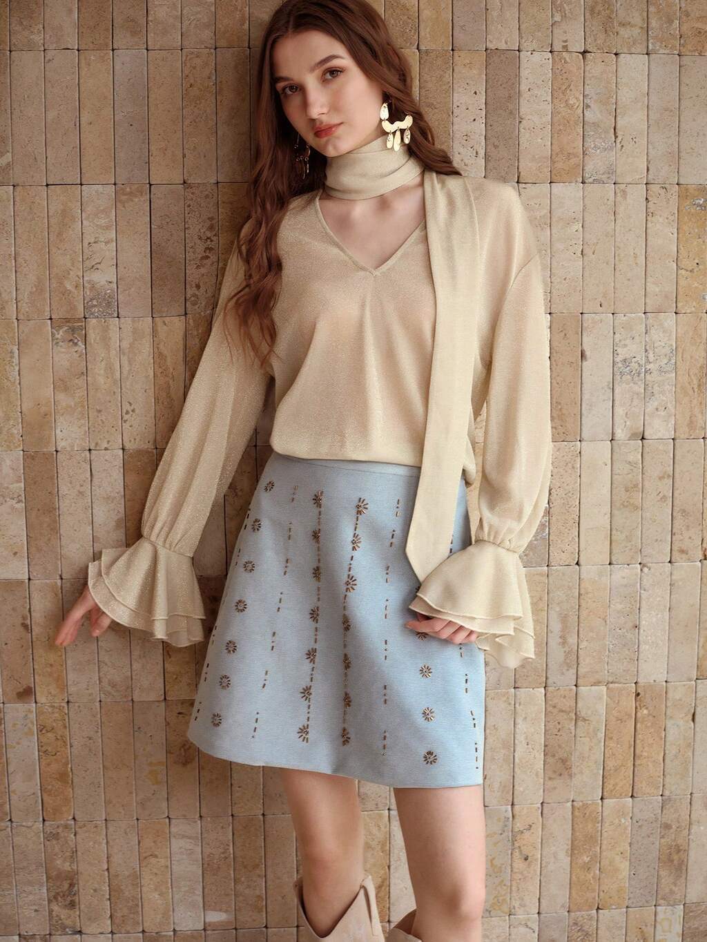 V-NECK FEATHER & RHINESTONE DECOR FLARE SLEEVE SWEATER