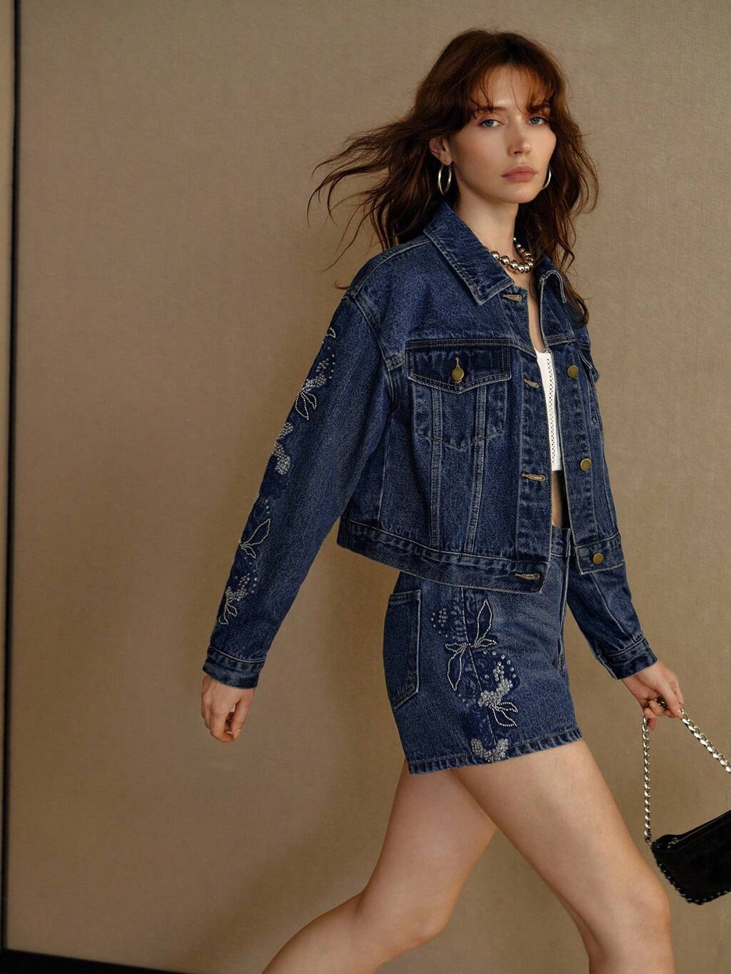 EMBROIDERY RHINESTONE DETAIL DENIM JACKET