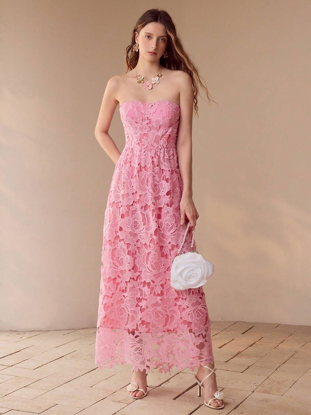 CONTRAST GUIPURE LACE TUBE DRESS, BELTED MIDI DRESS, VALENTINE'S DAY,SPRING/SUMMER