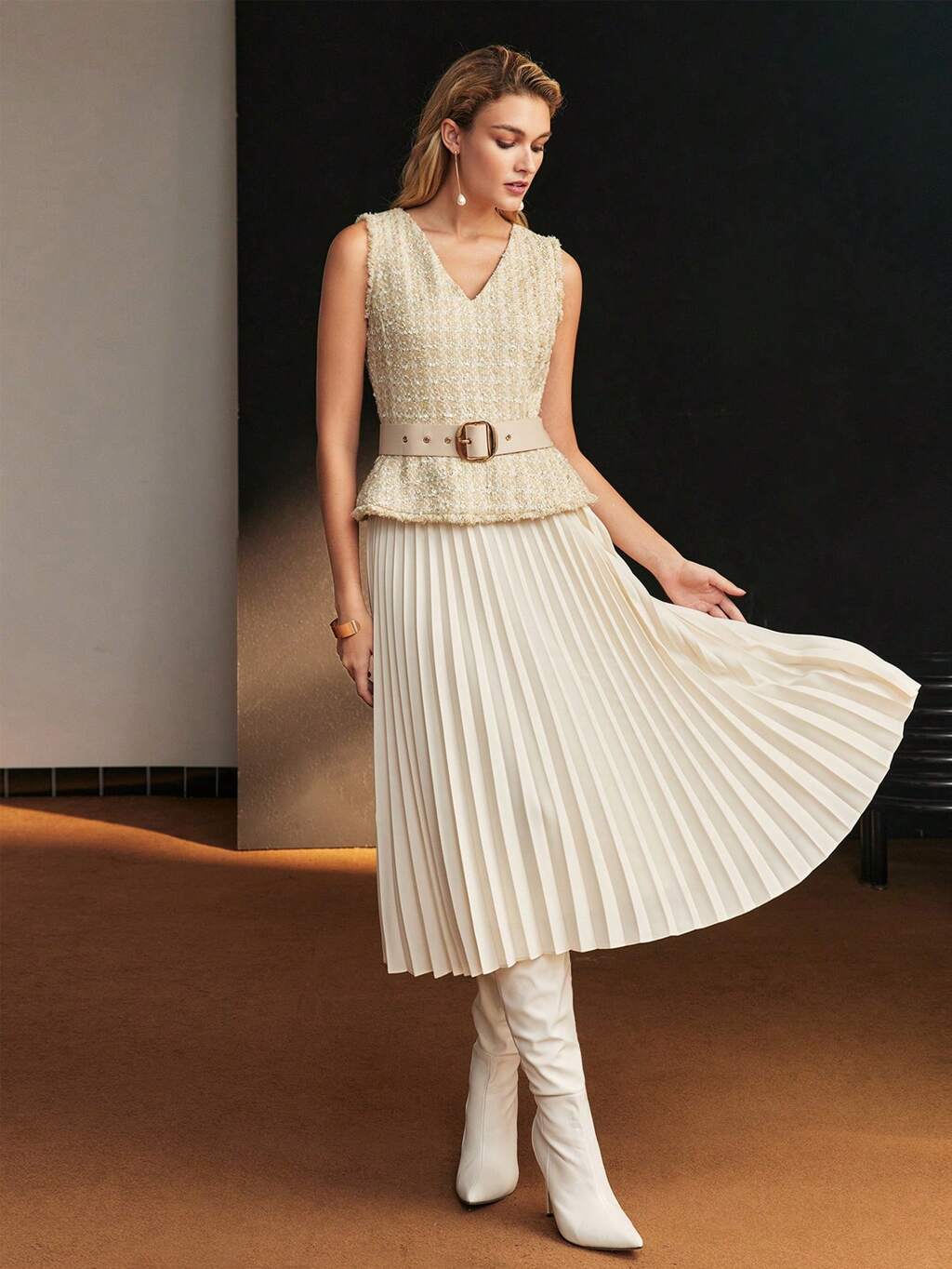 TWEED BODICE PLEATED HEM BELTED DRESS
