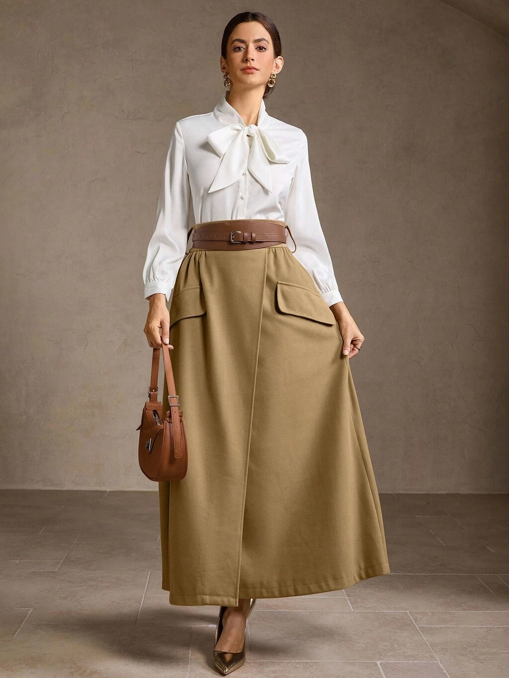 WOMEN'S KHAKI SKIRT, UNIQUE HIGH-END DESIGN WITH BELT, AUTUMN/WINTER A-LINE SKIRT, ELEGANT AND VERSATILE SLIMMING