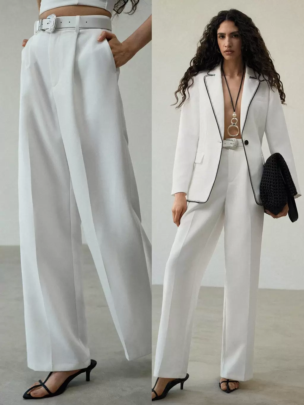 CONTRAST PIPING HIGH WAIST FOLD PLEATED WIDE LEG SUIT PANTS