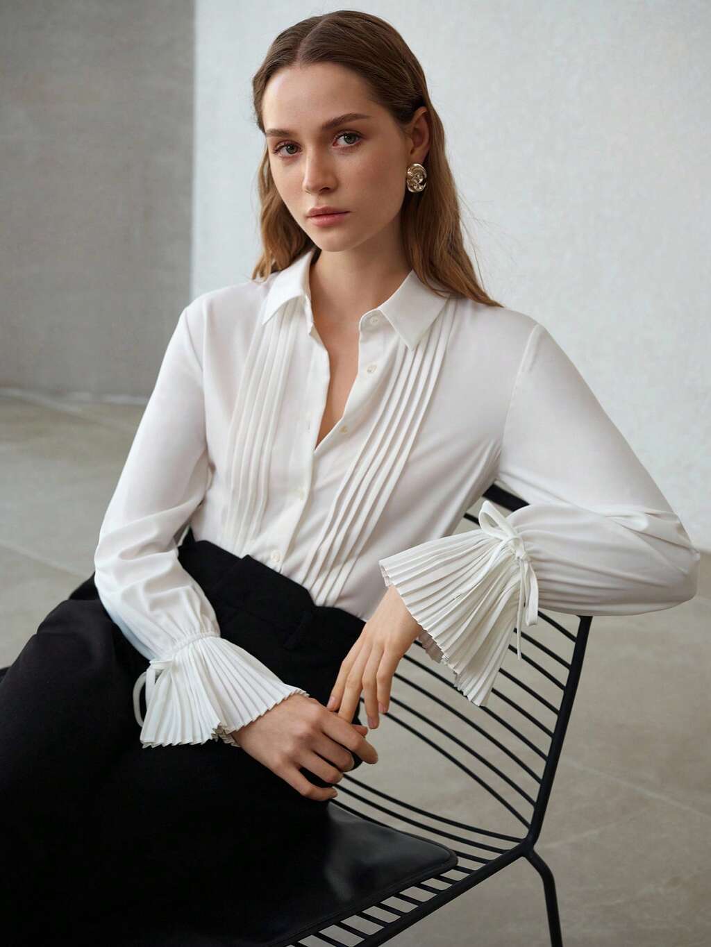 WOMEN'S SOLID COLOR PLEATED CUFF CASUAL BLOUSE