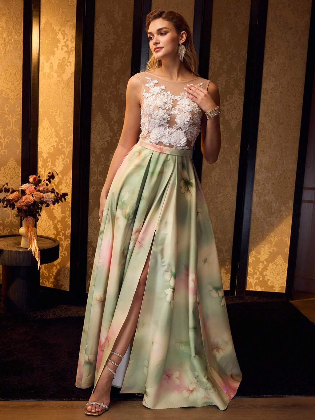 MOTF Soiréza WOMEN'S ELEGANT SLEEVELESS BACKLESS U-NECK FLOOR-LENGTH PARTY GOWN , FRONT CHEST FLORAL APPLIQUE , OVERSIZED GRADIENT FLORAL SKIRT & FORM-FITTING SILHOUETTE , IDEAL FOR WEDDINGS, GALAS & SPRING/SUMMER EVENINGS , STYLE WITH STRAPPY HEELS & DELICATE JEWELRY