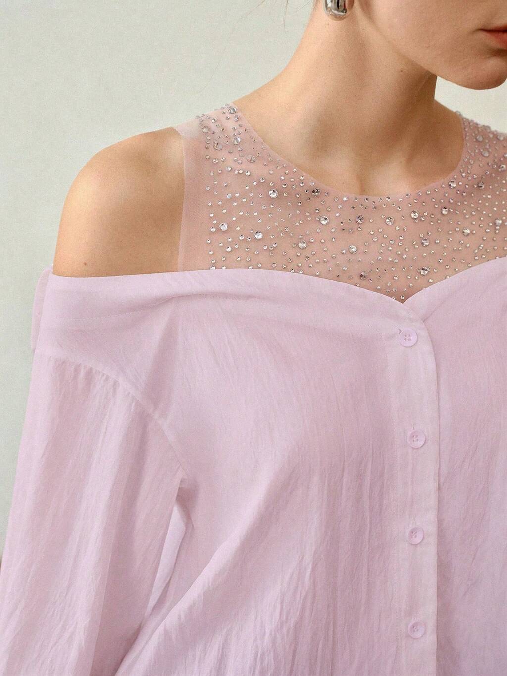 COLD-SHOULDER MESH PATCHWORK BLOUSE, UNIQUE RHINESTONE DETAIL BLOUSE