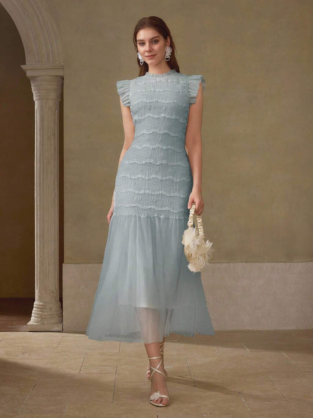 RUCHED FABRIC CONTRAST MESH ROMANTIC DRESS FOR VACATION