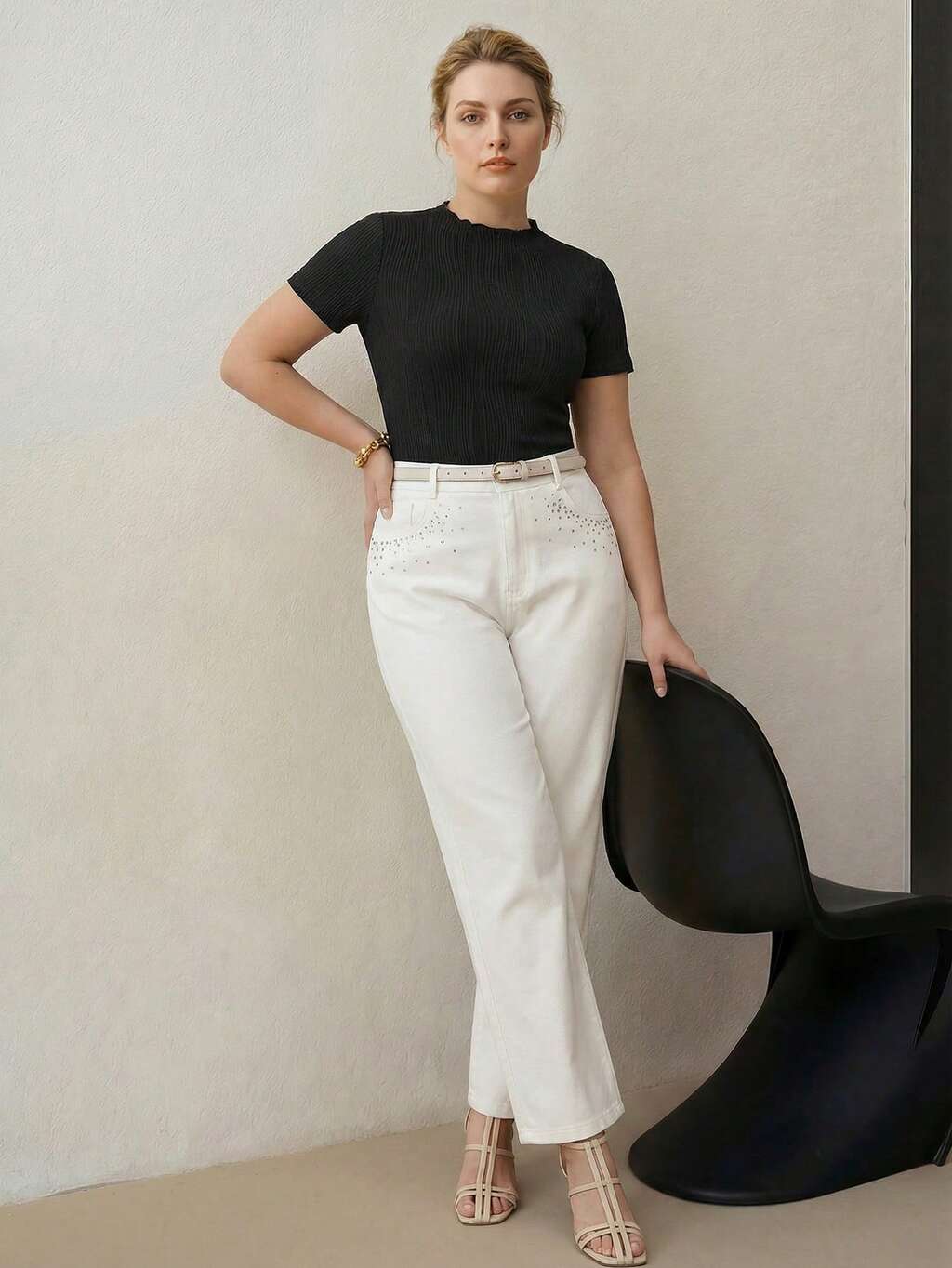 PLUS ELEGANT KNIT TEXTURED ELASTIC T-SHIRT WITH SMALL STAND COLLAR, SPRING/SUMMER