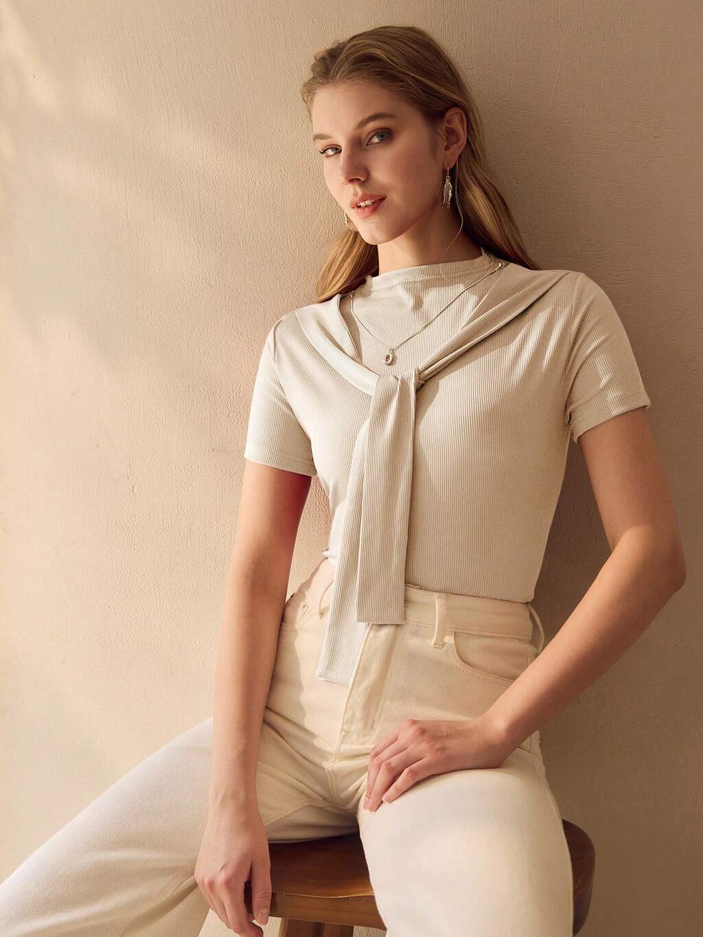 WOMEN'S CASUAL SOLID COLOR TWIST COLLAR SHORT SLEEVE FITTED TOP, SUMMER
