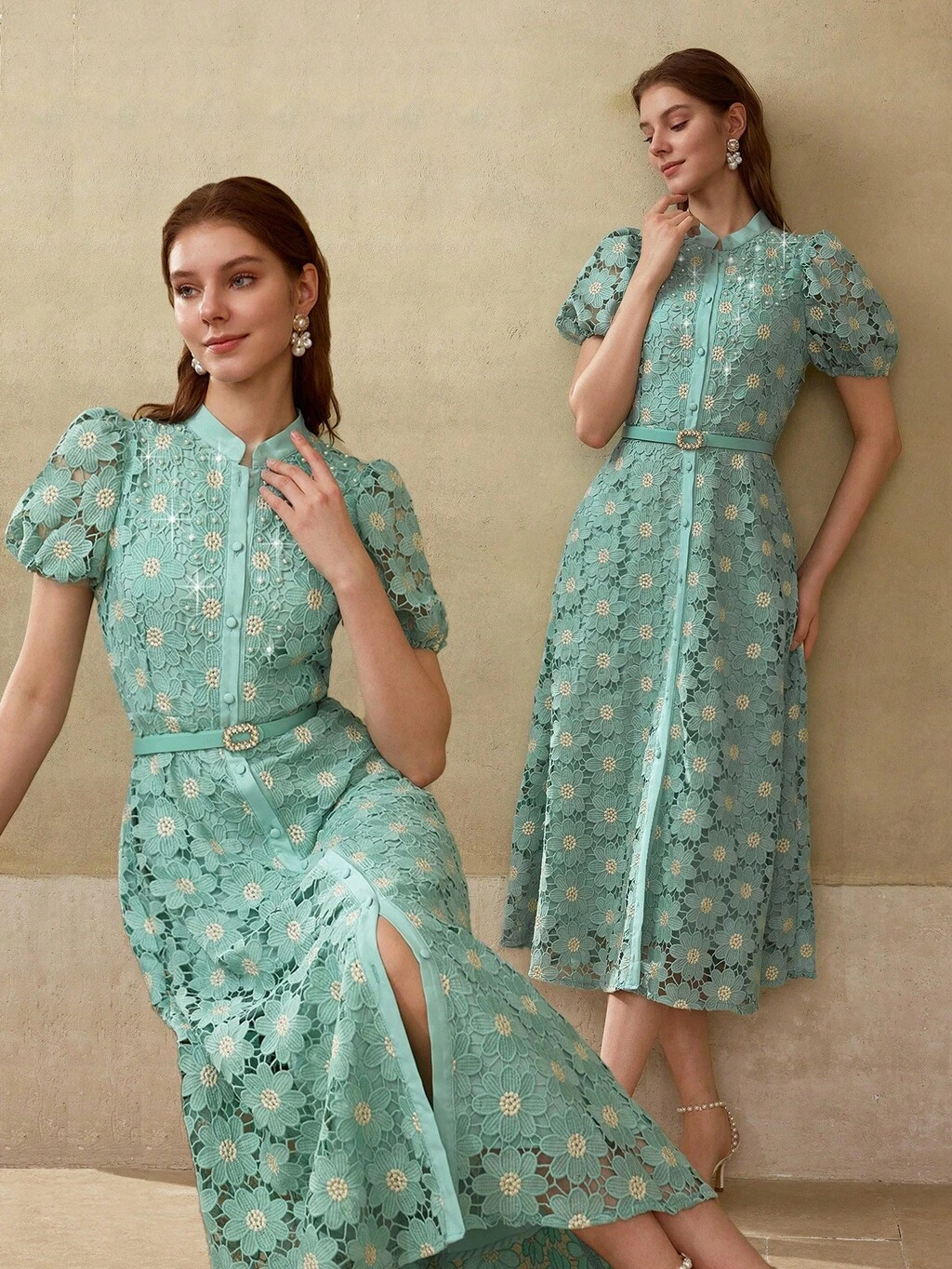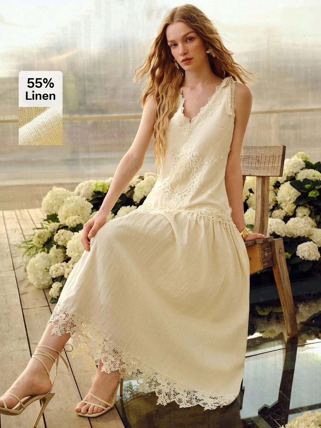 LINEN FLORAL PRINT FLARE HEM DRESS, SUMMER GREEN GARDEN PARTY LONG DRESS,SUMMER OUTFITS