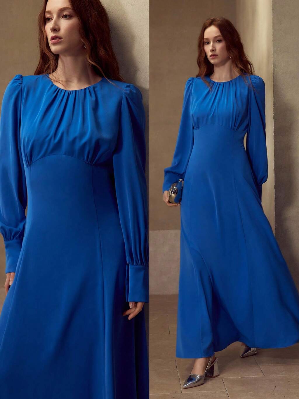 SOLID PUFF SLEEVE FOLD PLEATED BUST LONG DRESS