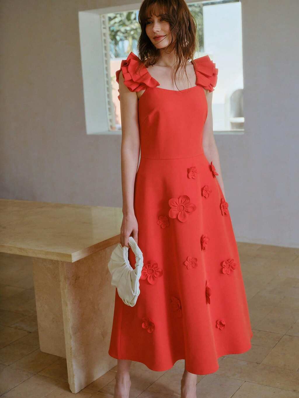 SOLID COLOR 3D FLORAL DECOR RUFFLE SLEEVE CINCHED WAIST MID-CALF DRESS