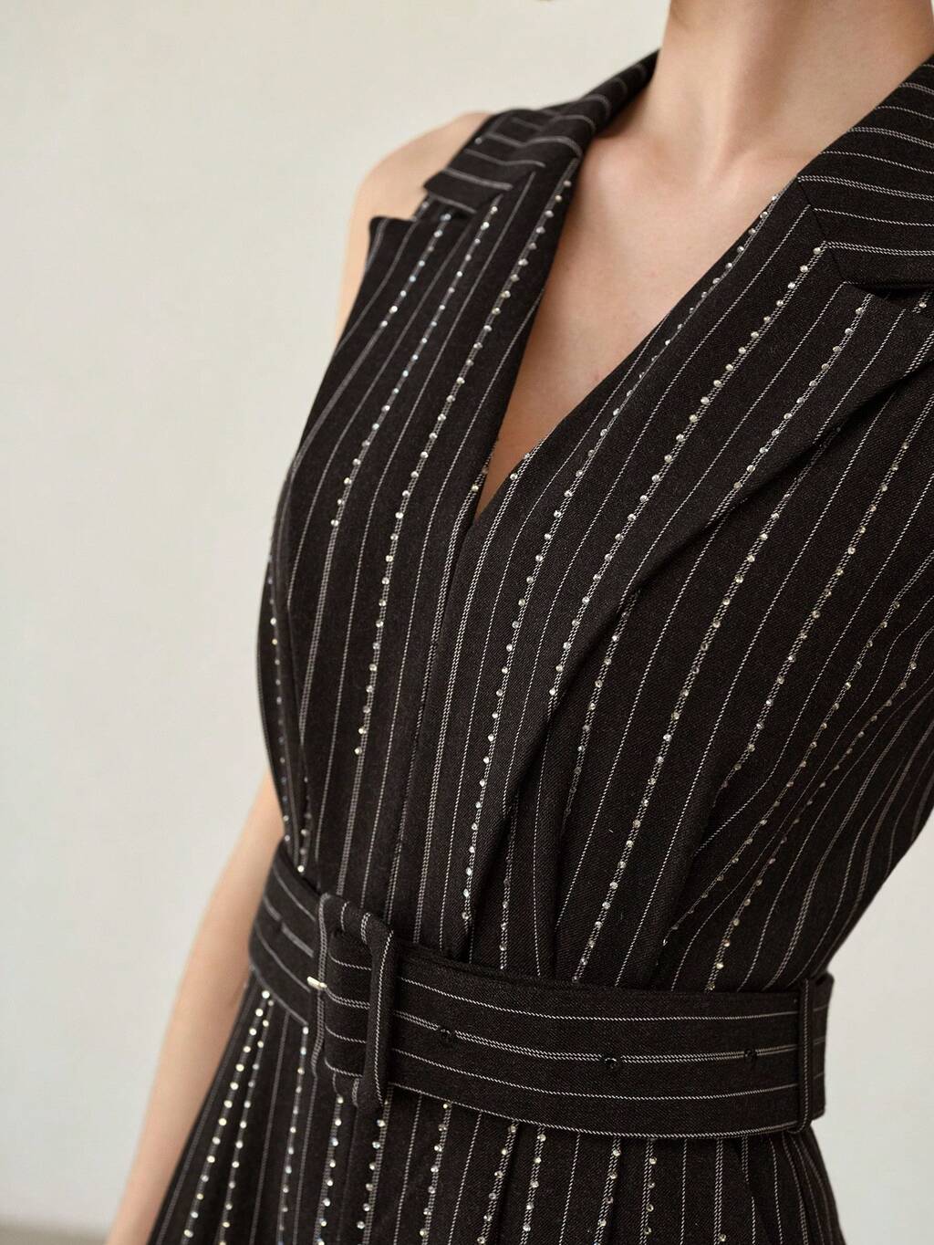 Gestreifter Jumpsuit mit Strass-Detail, Kragen mit Schnalle, Gürtel, ärmellos, weites Bein
