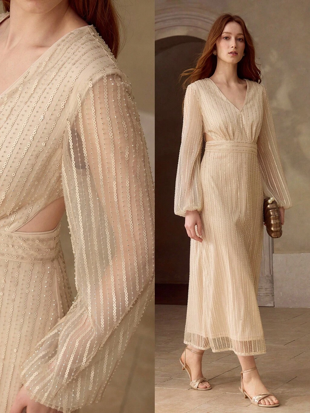 WOMEN'S SEQUINS MESH OVERLAY V-NECK LANTERN SLEEVE SEMI-SHEER DRESS, SUITABLE FOR DATES AND PARTIES