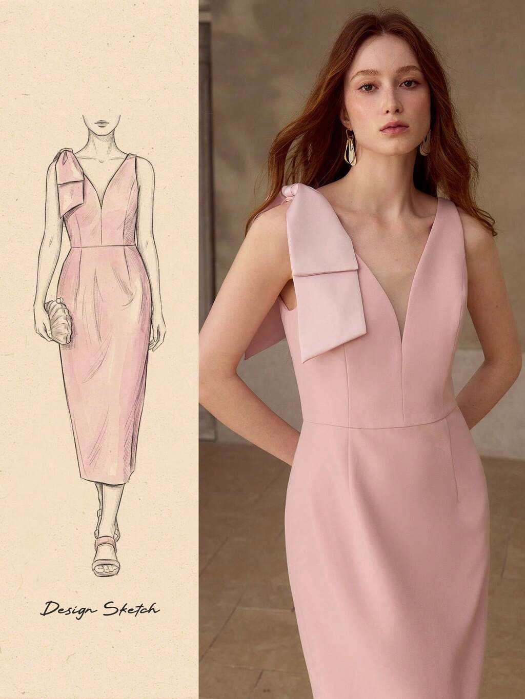 WOMEN'S BOW DETAIL MIDI DRESS, SUITABLE FOR DATES, PARTIES, AND FORMAL EVENTS