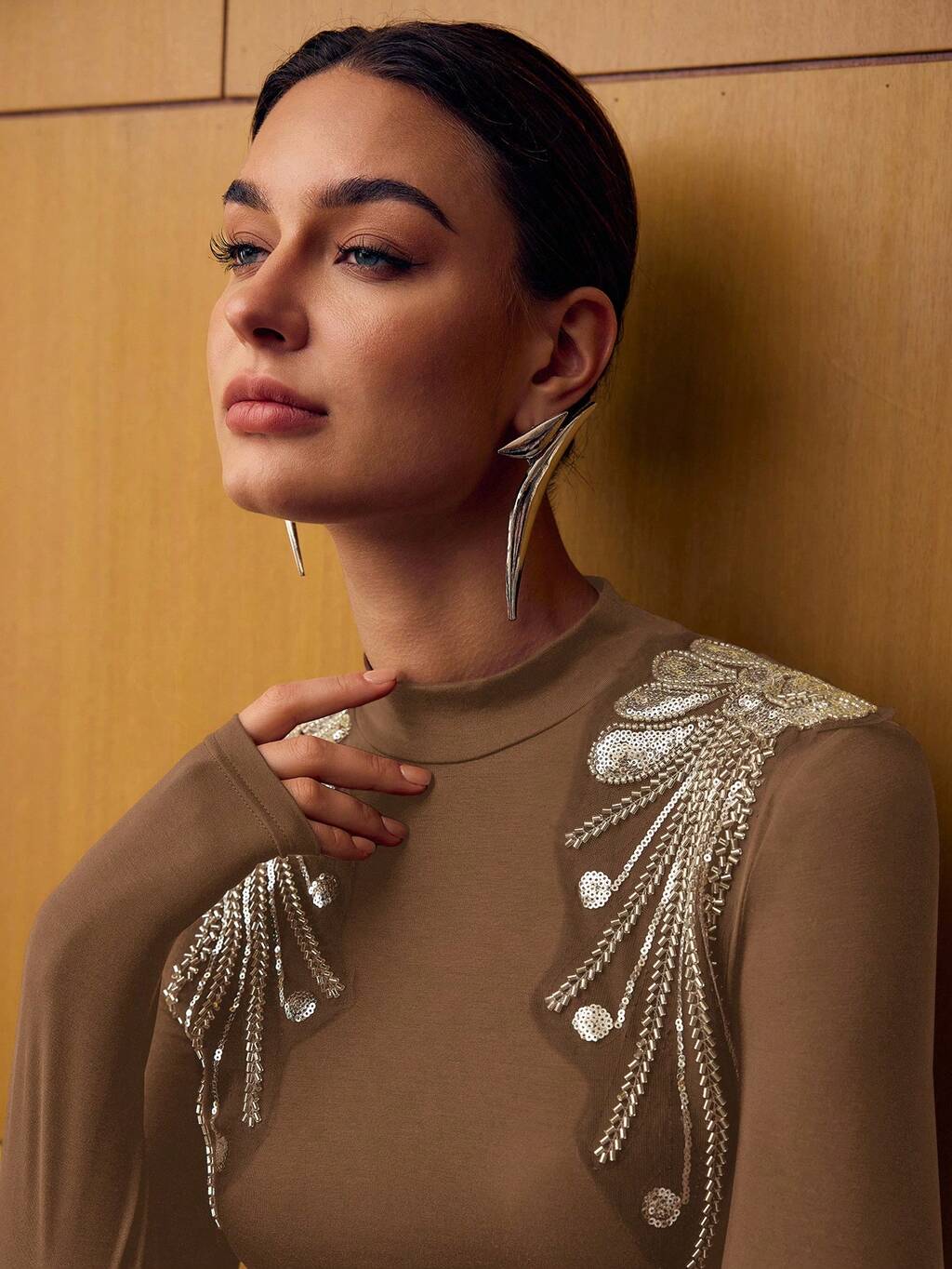WOMEN'S LONG SLEEVE SEQUIN BEADED EMBROIDERED BASE LAYER T-SHIRT
