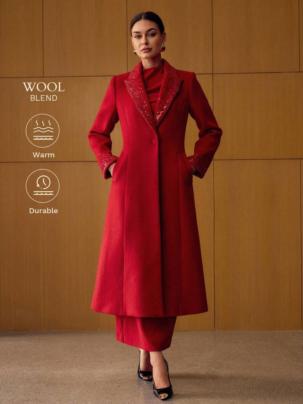 ウール エレガントロングオーバーコート ラペル付き ダブルブレスト ラインストーンデコレーション 秋冬