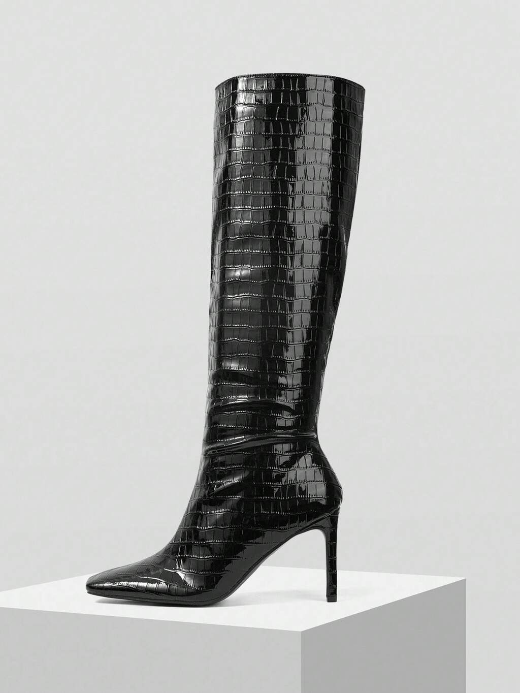 PLISSIERTE LACKLEDERSTIEFEL BIS ZUM KNIE, SCHMALER HOHER SCHAFT STILETTOABSATZ DAMENSTIEFEL