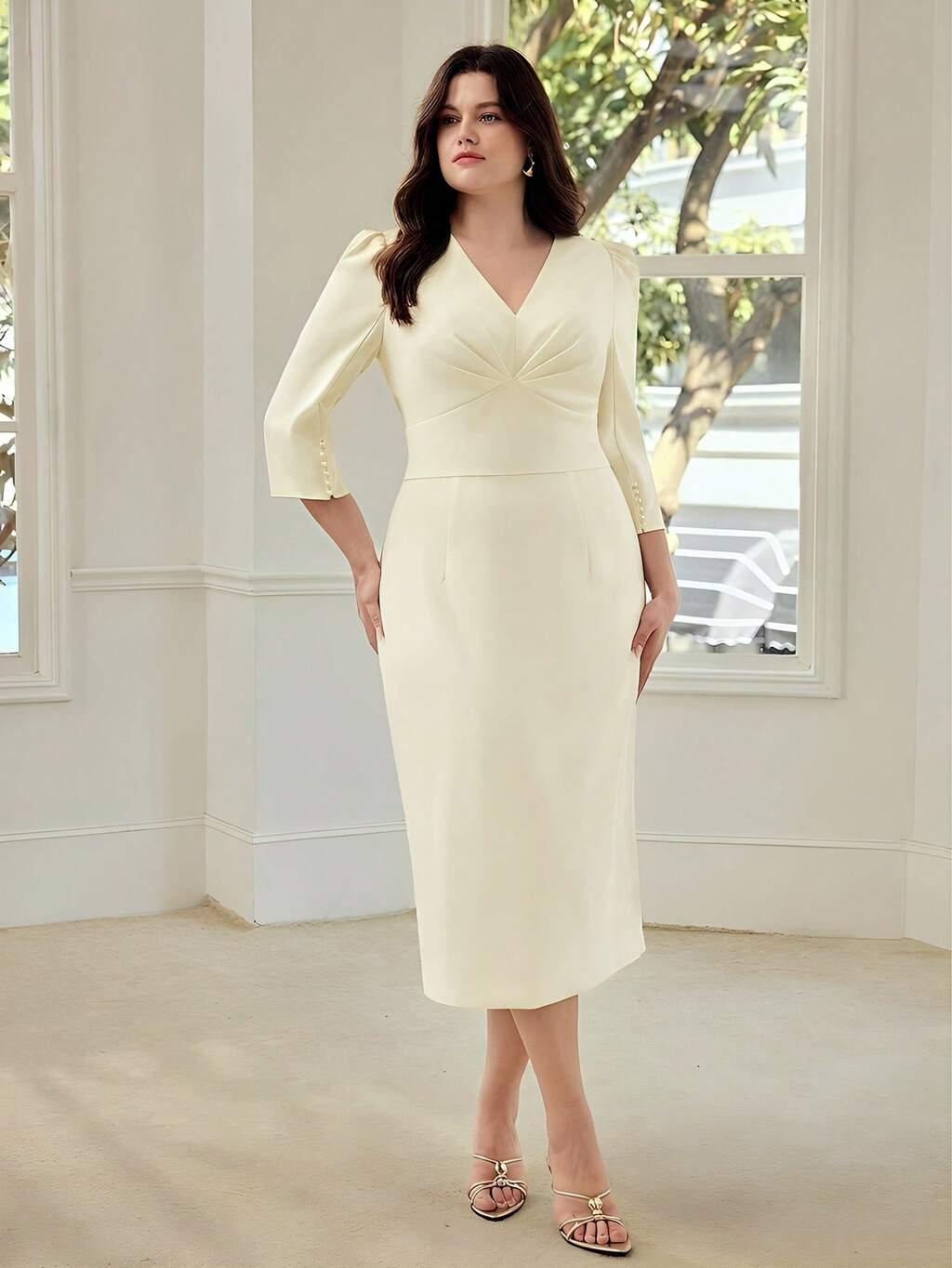 PLUS ELEGANTES MIDI-KLEID MIT PETAL-ÄRMELN UND VORDERER RAFFUNG, ROMANTISCHES HOCHZEITSGAST-KLEID