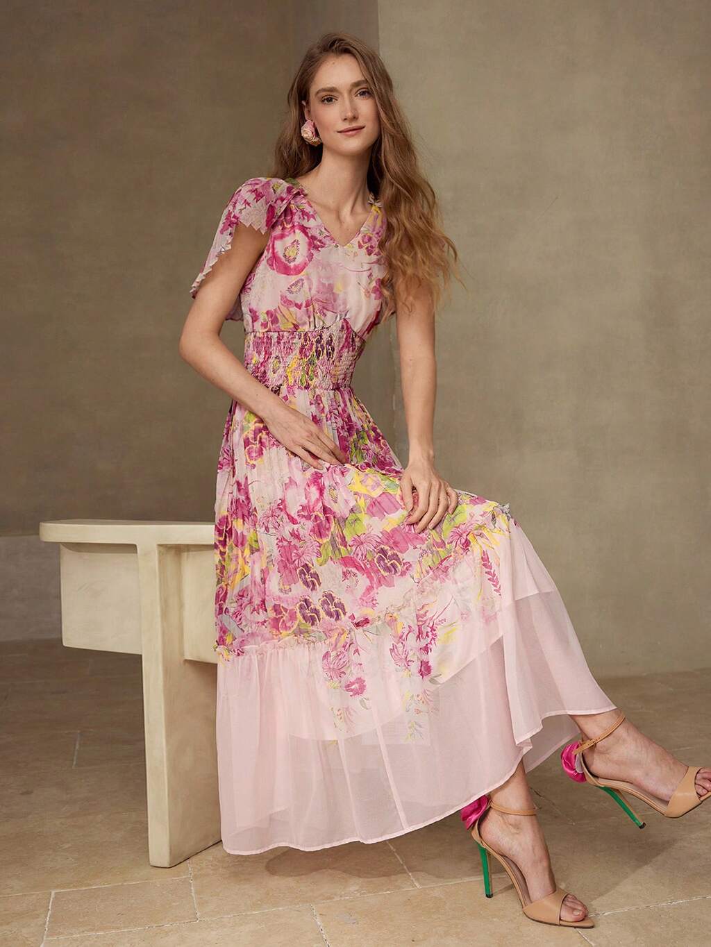 ELEGANTE VESTIDO/CUBRECUERPO MAXI DE PLAYA DE GASA SEMITRANSPARENTE CON CUELLO EN V, MANGAS ABOMBADAS Y ESTAMPADO PARA MUJERES