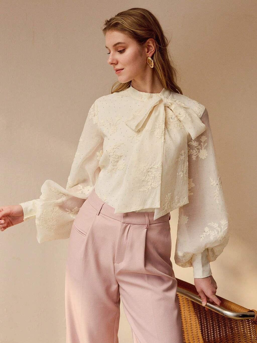 Camisa con cuello de jabot y mangas de linterna de jacquard