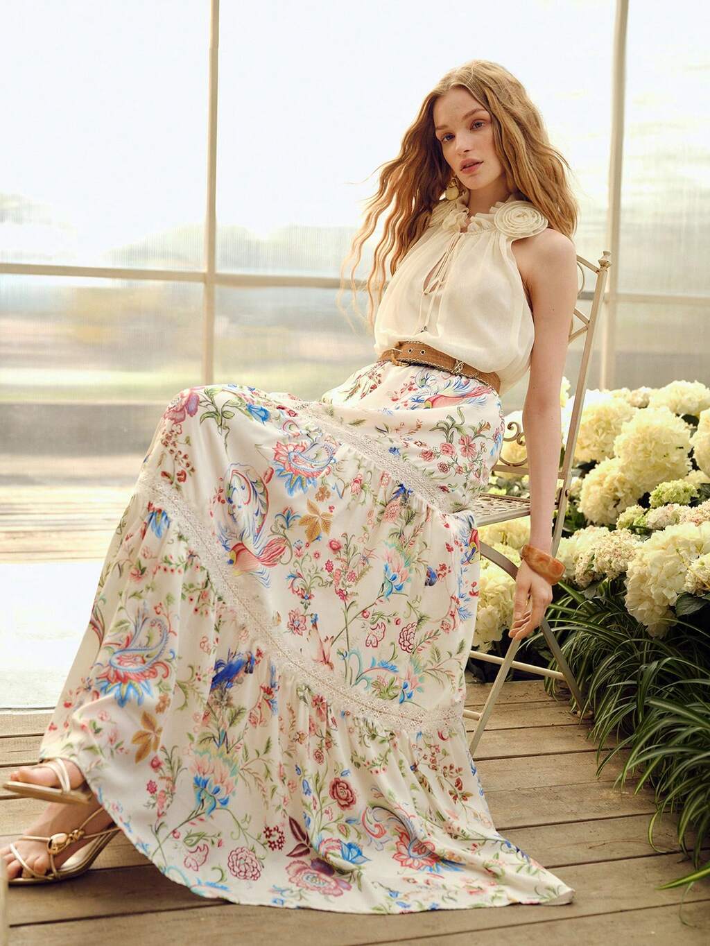 Vestido de gasa con estampado floral, con volante y flor 3D en la cintura