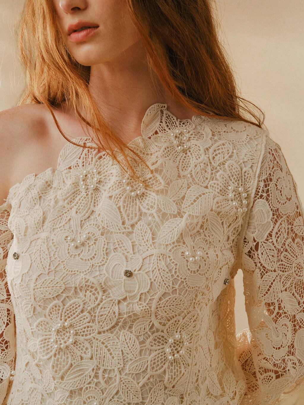 BLUSA ELEGANTE DE MUJER CON CUELLO OBLICUO ASIMÉTRICO DE ENCAJE HUECO A GANCHILLO