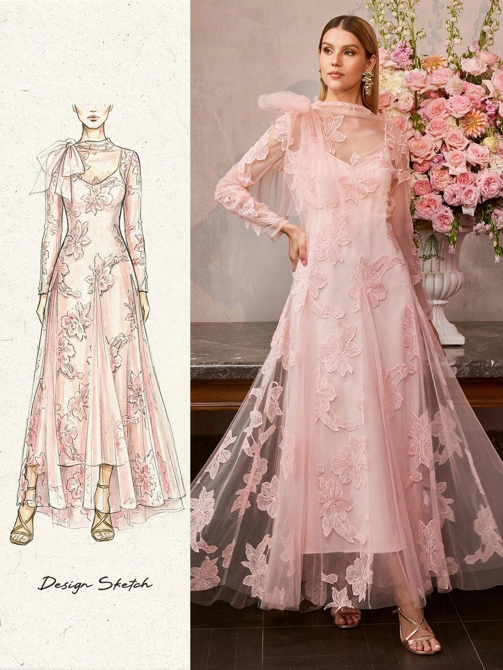 MOTF Soiréza VESTIDO LARGO DE MUJER DE MALLA CON BORDADO DE LENTEJUELAS Y FLORES