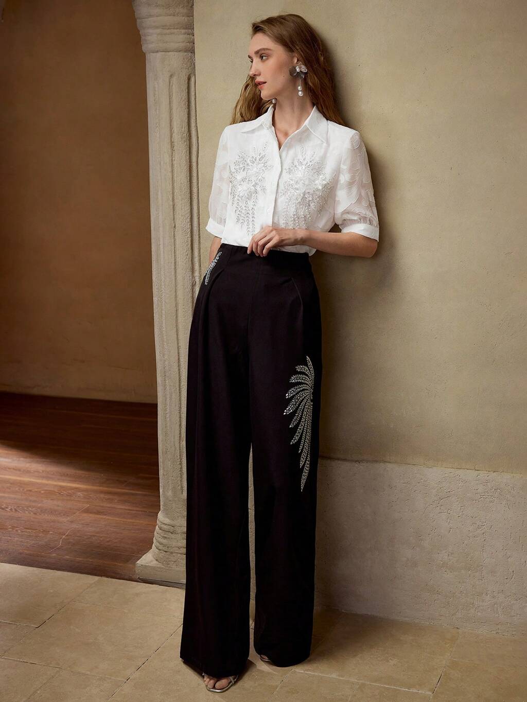 TOP DE MANGA FAROL CON CUELLO DE CORBATA, BORDADO FLORAL CON LENTEJUELAS DE CONTRASTE