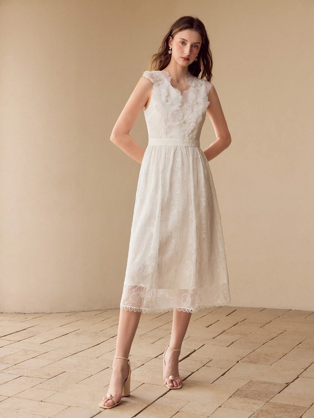 VESTIDO MIDI DE ENCAJE CON PARCHES FLORALES HECHO A MANO