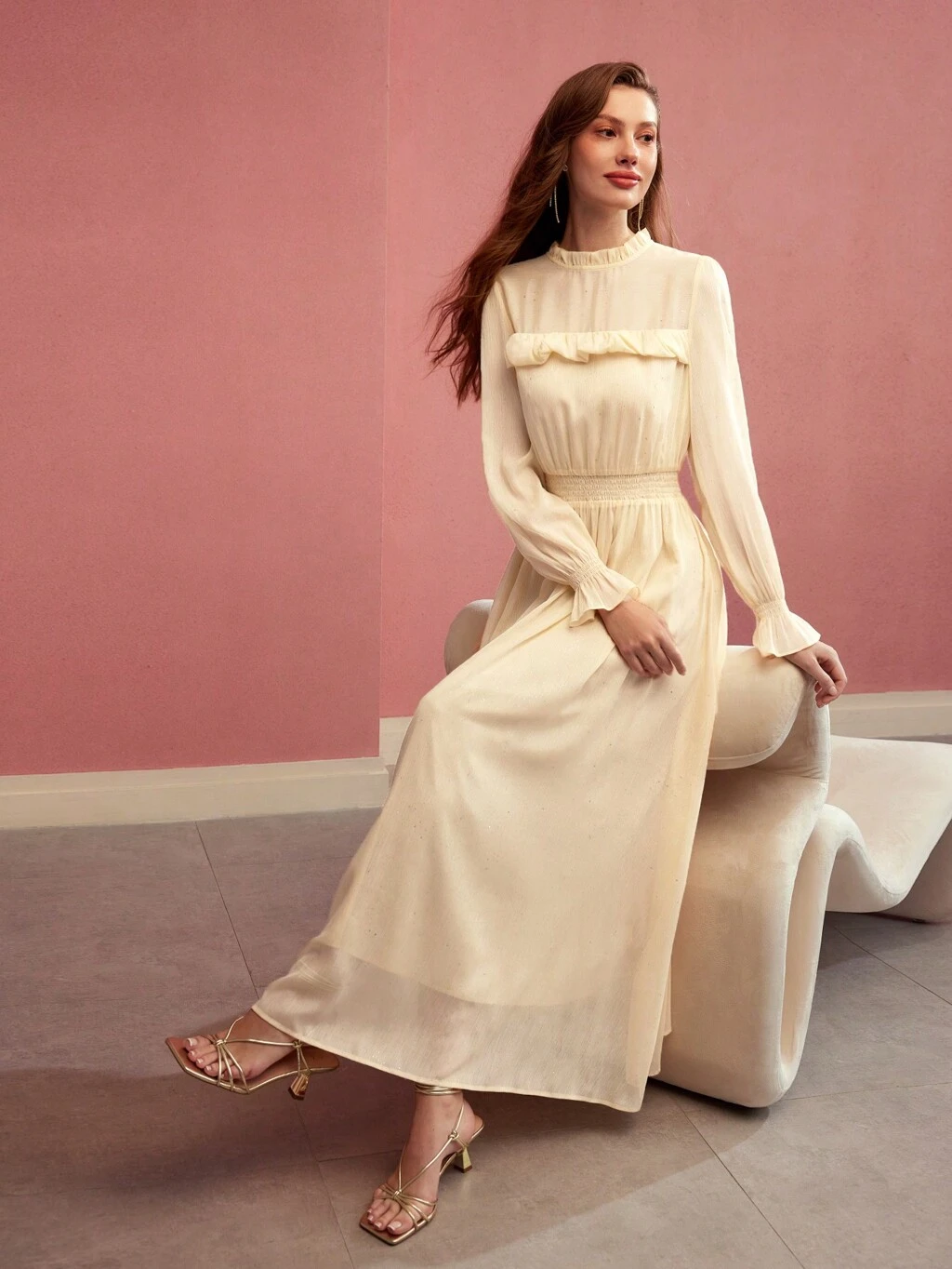ZEYLAH Vestido largo con mangas de linterna, dobladillo plisado, adornado con aplicaciones de strass y perlas falsas, y cinturón