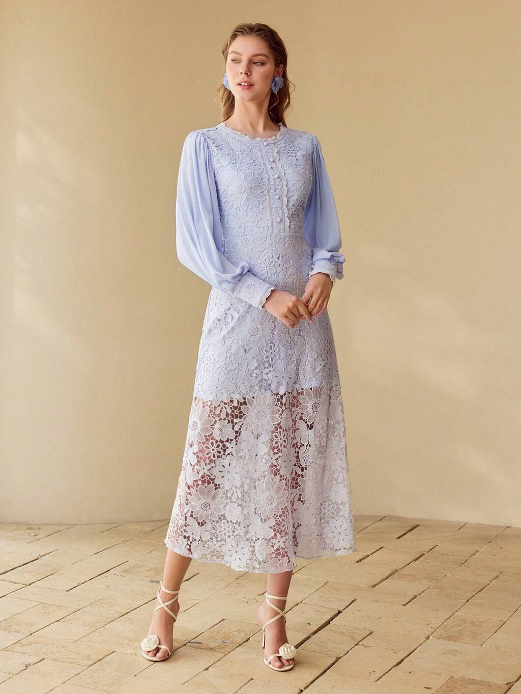 VESTIDO CON MANGA FAROL DE ENCAJE GUIPUR DE CONTRASTE